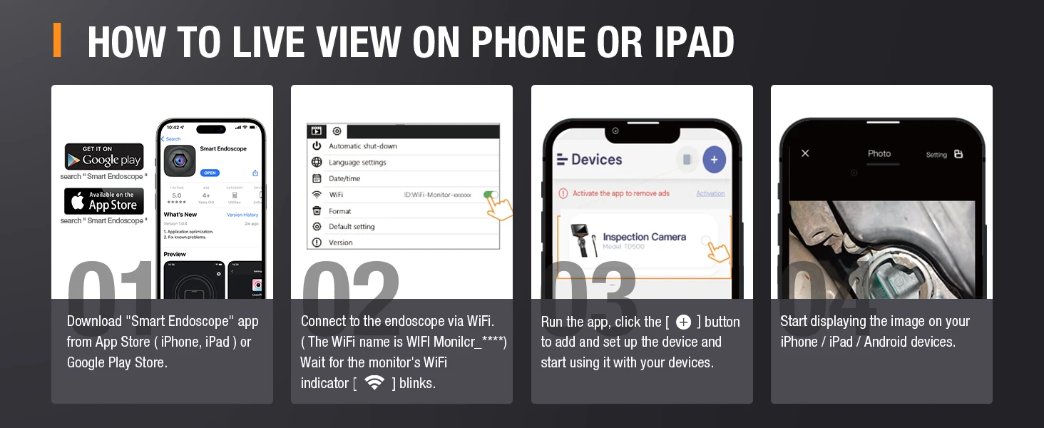 4. Stream Inspection Images - Built-in wireless adapter, images can be shared with colleagues using a tablet during the inspection. This helps make it easy to diagnose problems with the help of other inspectors.